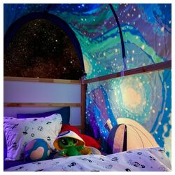 Когда космическая ракета вернулась на Землю, а игры на сегодня закончены, пора закругляться и готовиться ко сну. Приключения могут продолжиться в сказке на ночь и во сне. Ведь при выключении света рисунок планеты на шторе AFTONSPARV будет светиться. Что это было? Может быть, космический корабль, полный дружелюбных зеленых инопланетян. Или падающая звезда, чтобы вы могли загадать желание...
