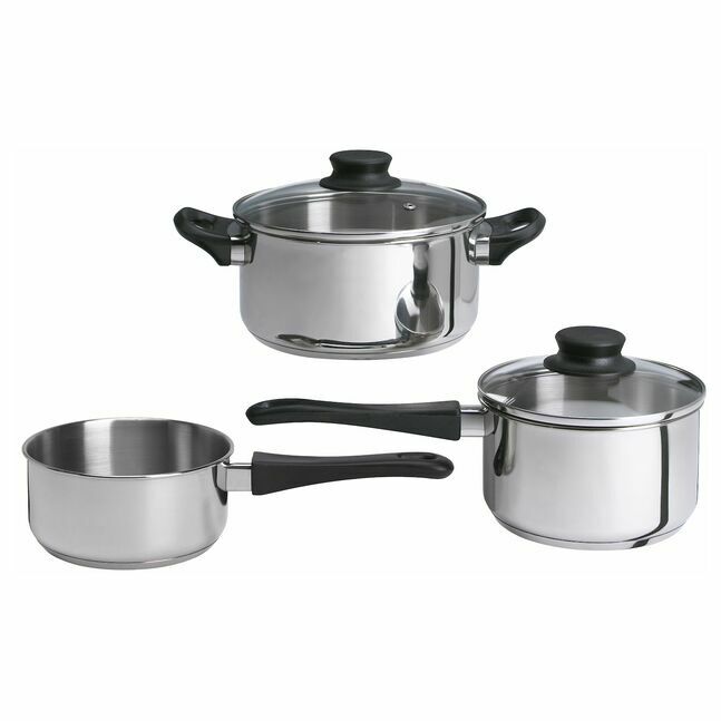 В комплект входят: Сотейник 0,9 л, сотейник с крышкой 1,7 л и кастрюля с крышкой 2,8 л.
