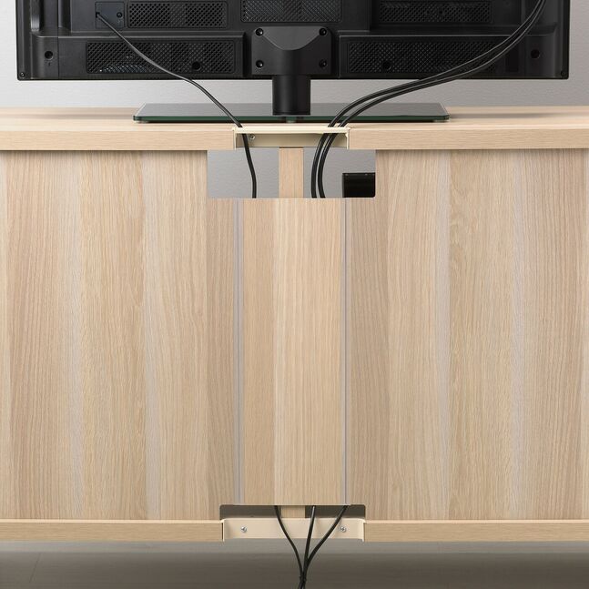 Тумба для телевизора BESTÅ имеет кабельные розетки на задней стенке, что позволяет легко скрыть все кабели и при этом держать их под рукой. А розетка для кабелей в верхней части обеспечивает беспрепятственный проход кабелей, даже если телевизор закреплен на стене.
