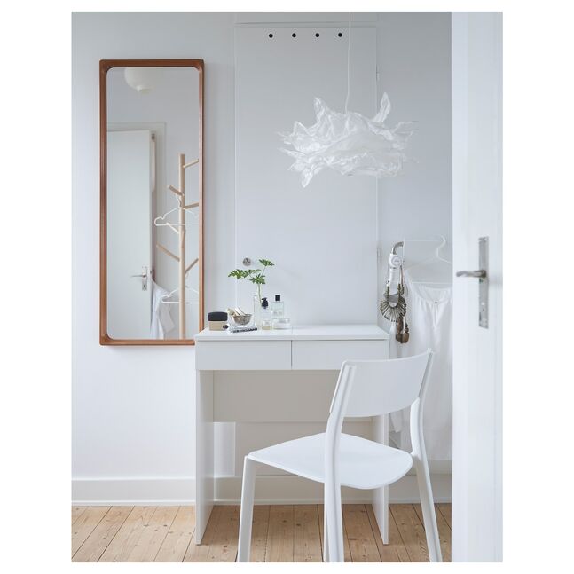 "Жизнь в небольшом пространстве часто предъявляет большие потребности в умных решениях для хранения. Именно эту проблему мы хотели решить, создав BRIMNES - серию функциональной мебели для спальни с системой хранения в каждом предмете. И по низкой цене. Этот туалетный столик - один из примеров. Он оснащен вместительным выдвижным ящиком и практичным отделением под откидной крышкой с зеркалом. Независимо от того, используете ли вы его в качестве туалетного столика, письменного стола или серванта, вы можете легко комбинировать его с другой мебелью из этой серии."