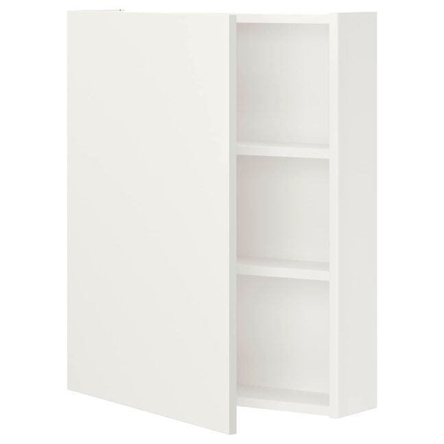 Серия ENHET позволяет легко начать новую жизнь на кухне, в ванной или прачечной. Этот настенный шкаф с полками обеспечивает хороший обзор бутылок и банок, а чисто белая дверца делает комнату светлее.