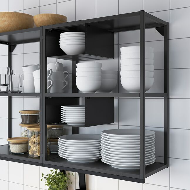 Почему бы не выбрать идеальное сочетание открытого и закрытого хранения? Поместите часто используемые предметы в открытые рамы ENHET, а вещи, которые часто захламляют пространство, спрячьте в закрытые шкафы ENHET.