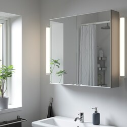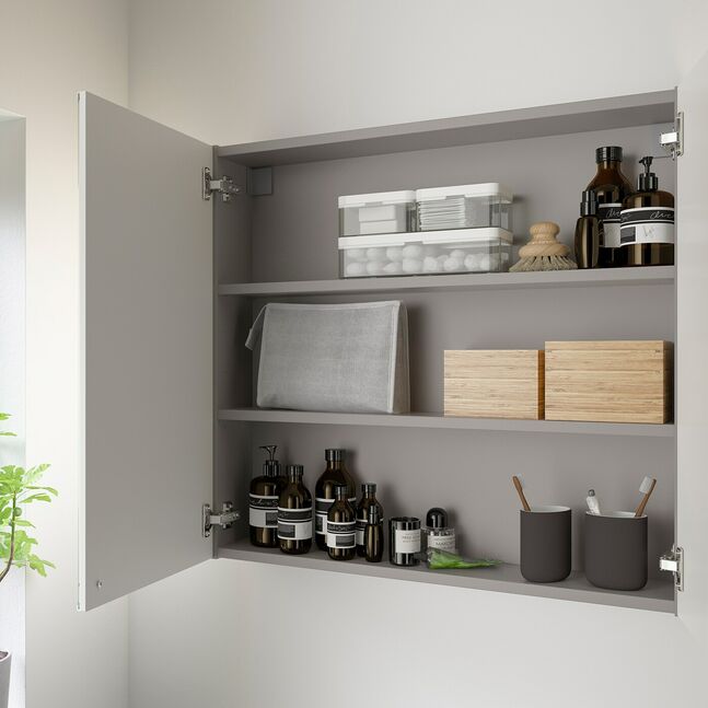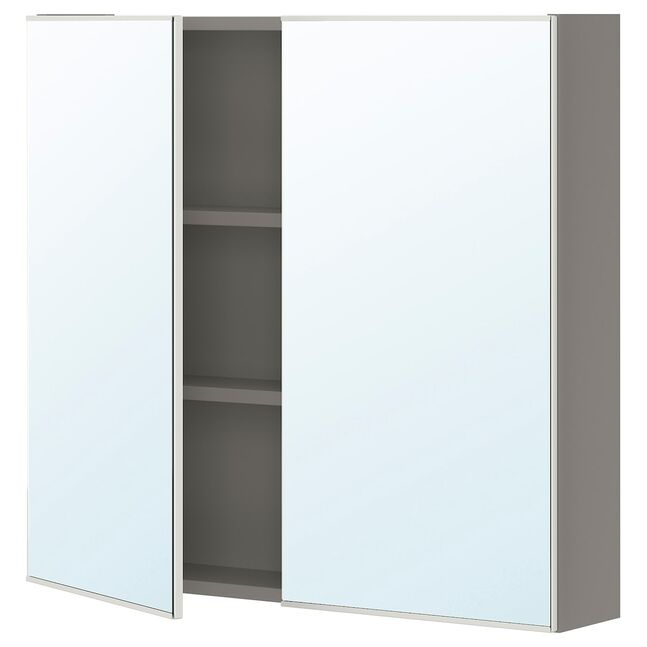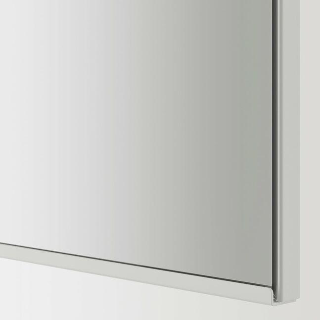 Зеркальные дверцы над умывальником облегчают утреннюю рутину и делают комнату больше и светлее. Легко сочетаются с дверцами и фасадами ящиков ENHET и мебелью, которая уже есть у вас дома.