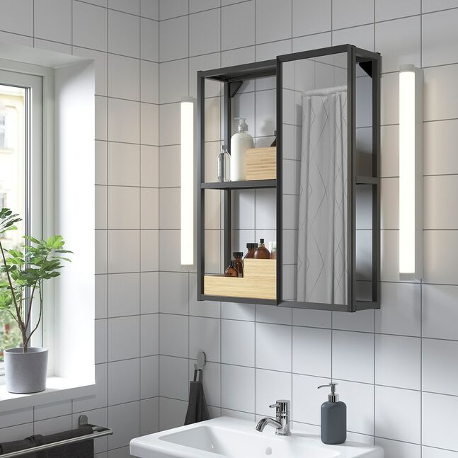 Подвесное зеркало ENHET для рамы легко крепится к стене, чтобы вы могли наслаждаться видом в мгновение ока. Оно сдвигается в сторону, обеспечивая легкий доступ к предметам повседневного обихода.