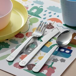 Для детей чуть постарше столовые приборы сделаны из металла. Теперь пришло время резать и делить еду - рифленый край лезвия ножа облегчает эту задачу. Все металлические края столовых приборов аккуратно закруглены, чтобы дети не поранились.