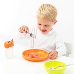 Нож имеет такую форму, что ребенок может использовать большую часть режущей кромки даже на тарелке с высоким бортиком.