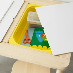 Столешница детского стола FLISAT состоит из двух крышек, которые подходят к ящикам для хранения TROFAST. Ваш ребенок сможет всегда держать игрушки под рукой и быстро убирать за собой!