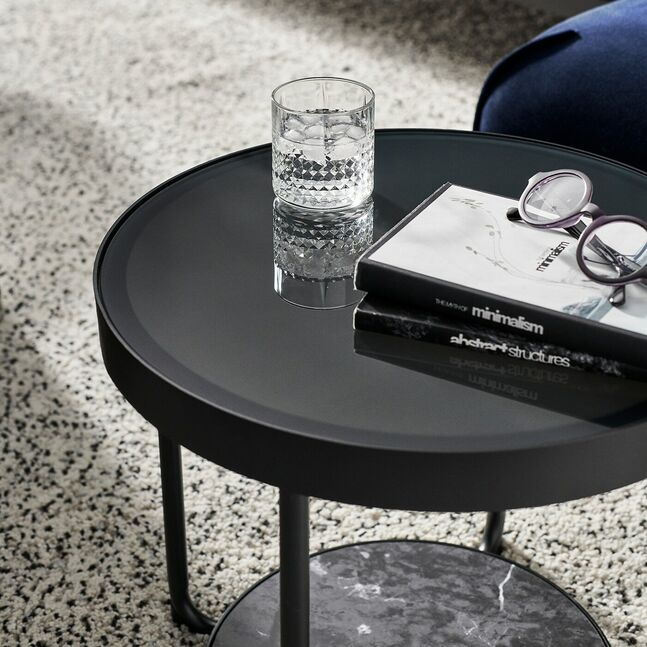 Продуманный дизайн с использованием различных материалов и отделок: столешница из дымчатого стекла, ножки из трубчатой стали с порошковым покрытием и основание с мраморным эффектом придают столу индивидуальный характер.