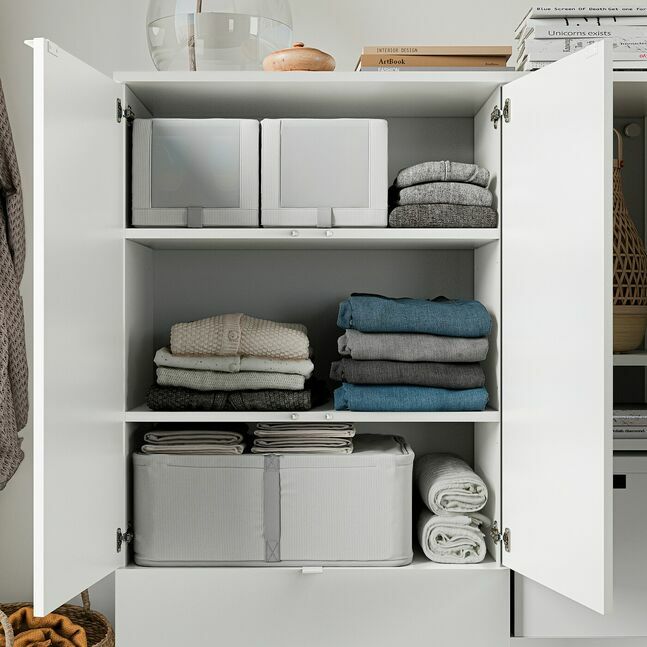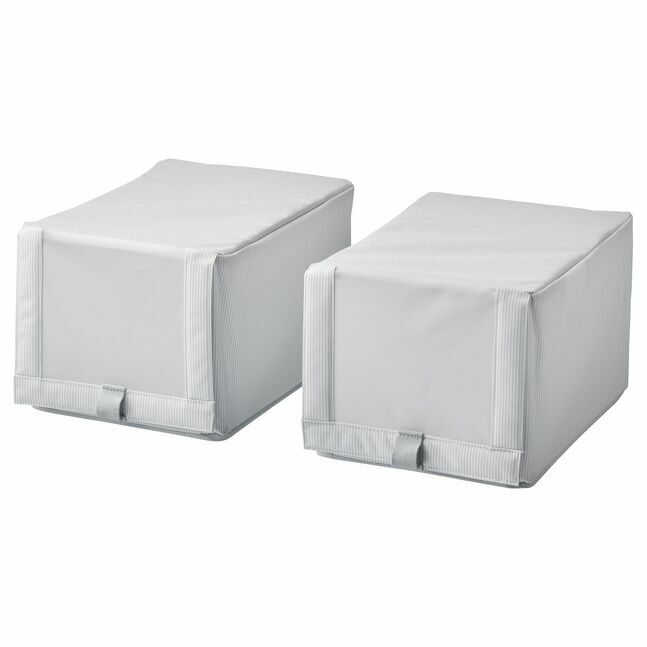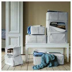 Часть серии HEMMAFIXARE - прочные и штабелируемые коробки с тканевой обивкой разных размеров, которые помогут вам использовать каждый сантиметр пространства в шкафу для организации одежды, обуви и гаджетов.