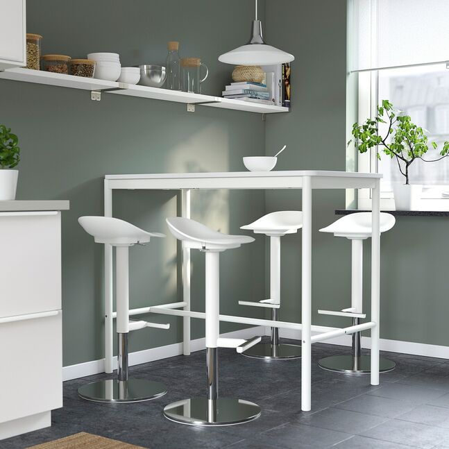 Если вы хотите создать приятную обеденную зону, но у вас ограниченное пространство, хороший совет - выбрать стулья и стол высотой с барную стойку. Они занимают меньше места и могут служить рабочей зоной. Выбирайте между несколькими вариантами высоты, стилей и материалов.