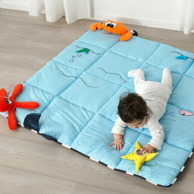 Игрушки, адаптированные для маленького ребенка, могут способствовать этим важным впечатлениям, стимулирующим развитие мозга. Но что же на самом деле делает ту или иную игрушку привлекательной для ребенка? "Часто это что-то, что выделяется в окружающей обстановке и привлекает к себе внимание", - говорит Кристер. "Может быть, черные точки на желтом жирафе или звук погремушки". Дизайнер Малин Уннборн, разработавшая коллекцию игрушек KLAPPA, стремилась найти те специфические детали, которые могли бы вызвать любопытство и привести к игре. "Например, для книжки с картинками и мяча я использовала контрастные цвета и ткани с разной структурой: глянцевые и матовые, мягкие и шершавые". На одеяле, игровом коврике и детском тренажере Малин сделала акульи плавники, уши и другие детали, которые торчат как раз настолько, чтобы маленькие и любопытные пальчики могли их ущипнуть.