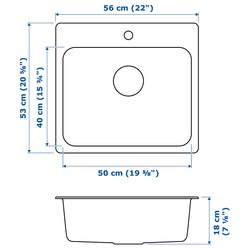 Врезная раковина LÅNGUDDEN немного глубже у заднего края, поэтому такие вещи, как моющее средство и щетка для мытья посуды, можно положить на стальной край, а не на столешницу.