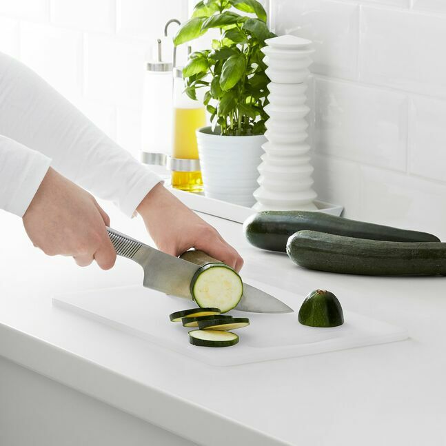Пластиковая разделочная доска проста в использовании и легко моется. Большинство из них можно мыть даже в посудомоечной машине. Полезно использовать несколько разных разделочных досок - это позволит избежать переноса вкусов и запахов между продуктами.