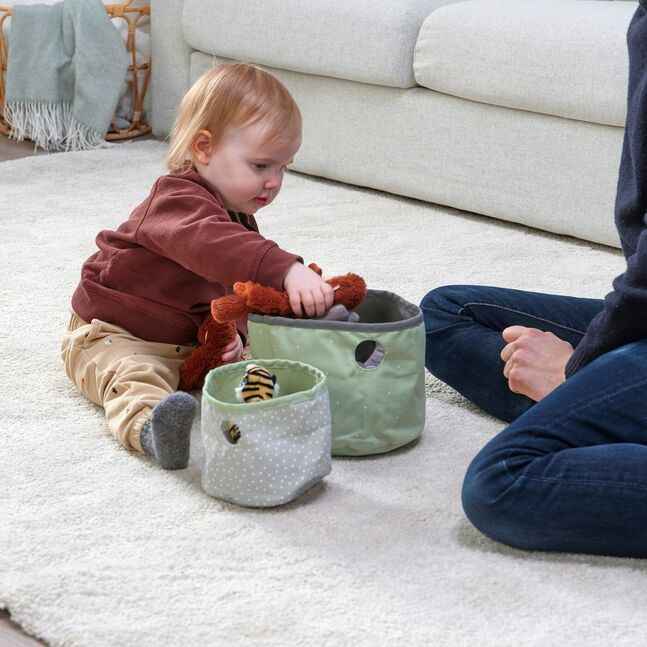 Эти двусторонние текстильные сумки столь же функциональны, сколь и декоративны. Они изготовлены из переработанного полиэстера в мягких пастельных тонах. Идеально подходят для хранения всего - от подгузников и пустышек до одежды и игрушек.