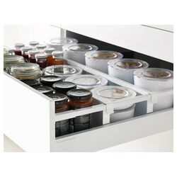 Может комплектоваться дополнительными стеклянными боковинами MAXIMERA для сохранения вещей на месте внутри ящика. Стекло позволяет видеть содержимое ящика сбоку (например, в высоком шкафу).