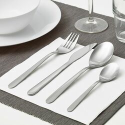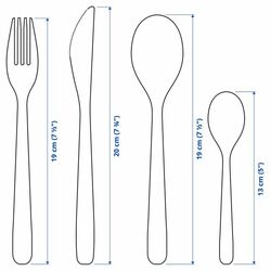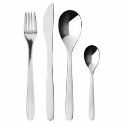 Состоит из: Вилка, нож, ложка и чайная ложка, по 4 штуки.