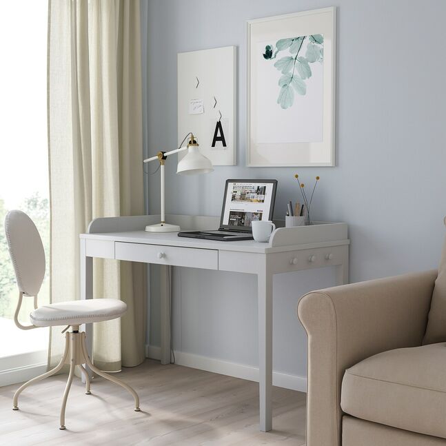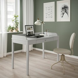 Аккуратный письменный стол в традиционном стиле с большой рабочей зоной, вместительным ящиком, ручками по бокам и 2 розетками для кабелей. Входит в серию SMYGA - мебель из прочного массива дерева, которая прослужит не одно поколение.