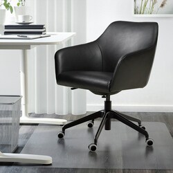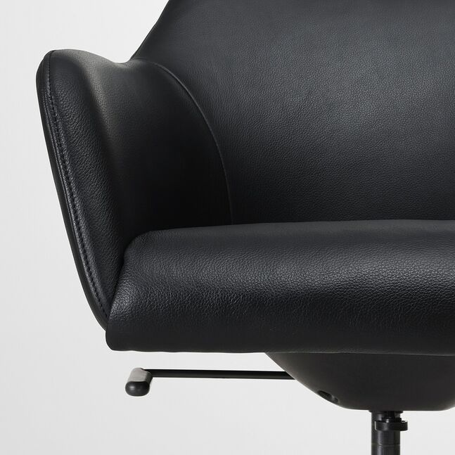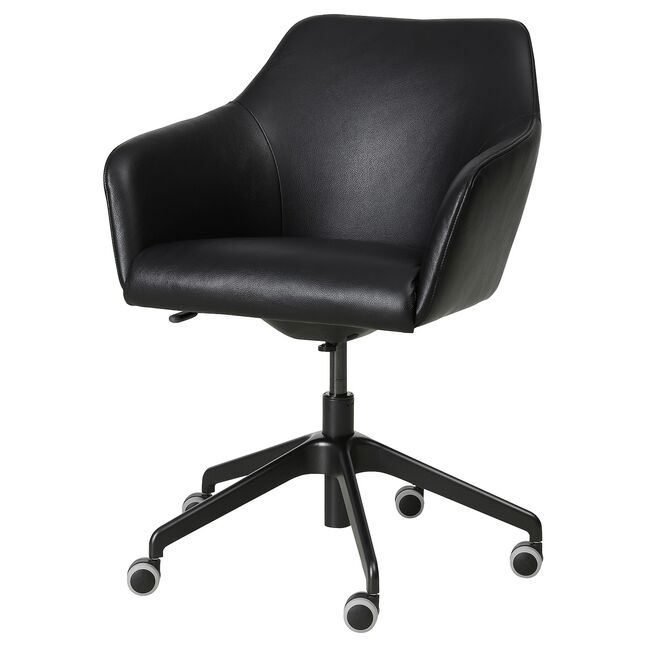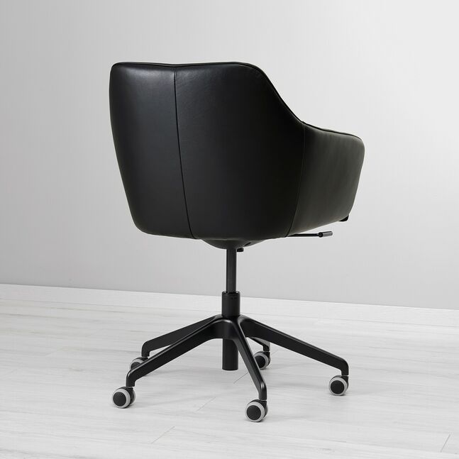 Вращающееся кресло с мягкими формами и приятной набивкой. Обивка из прочной кожи, которая хорошо сочетается с любым типом помещений, и колесики, которые позволяют легко перемещать его.