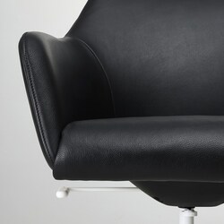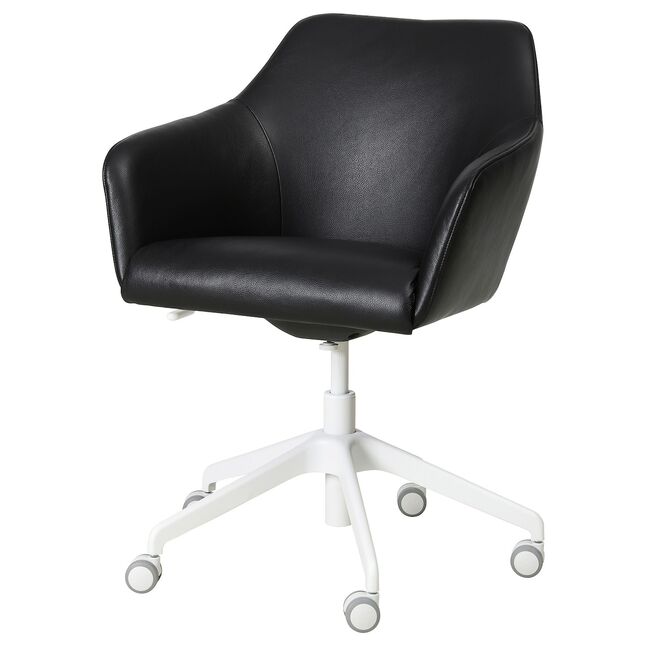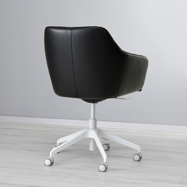 Вращающееся кресло с мягкими формами и приятной набивкой. Обивка из прочной кожи, которая хорошо сочетается с любым типом помещений, и колесики, которые позволяют легко перемещать его.