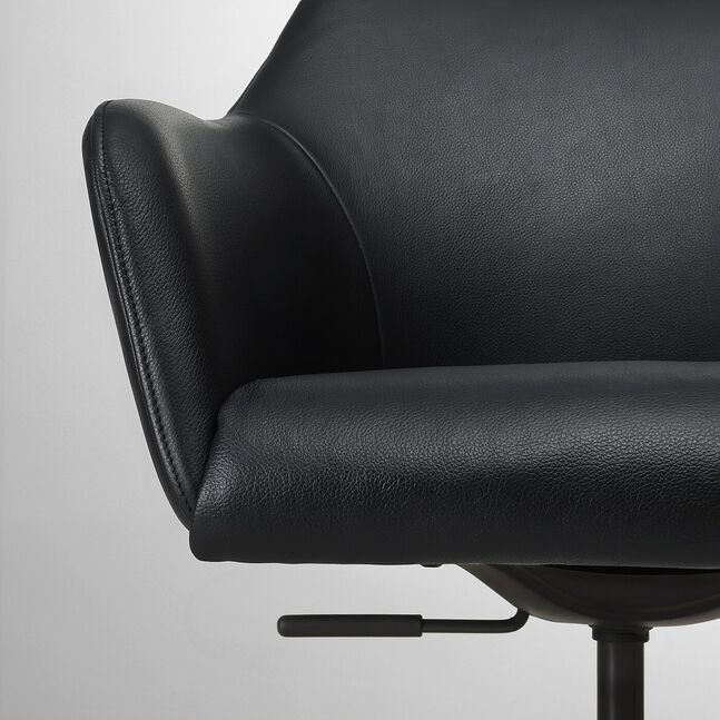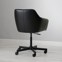 Вращающееся кресло с мягкими формами и приятной набивкой. Обивка из прочной кожи, которая хорошо сочетается с любым типом помещений, и колесики, которые позволяют легко перемещать его.