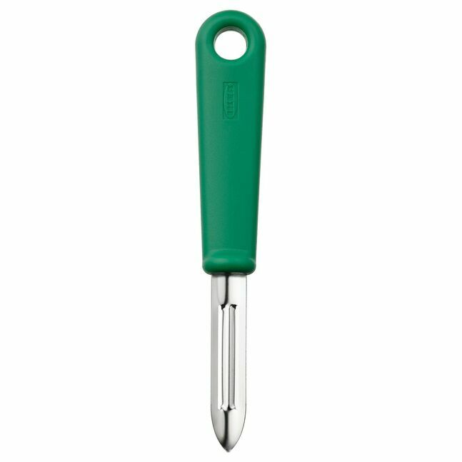 Легко вешать и хранить, так как ручка имеет отверстие в верхней части. Если вы решите положить овощечистку в кухонный ящик, разноцветная ручка поможет вам найти ее.