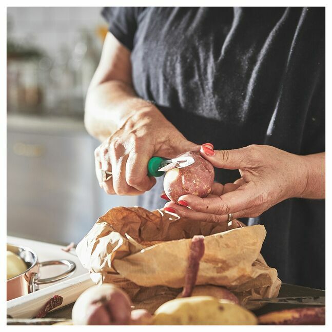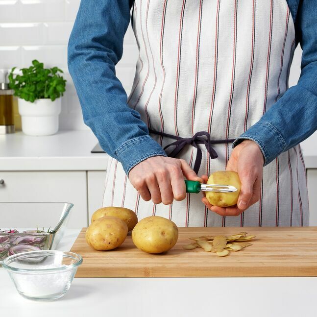 Картофелечистка UPPFYLLD поможет вам быстро снять внешнюю кожуру с любых корнеплодов.