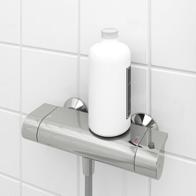 Удобно и безопасно благодаря ограничителю температуры 38°C, предотвращающему перегрев воды, и функции "холодное прикосновение", обеспечивающей безопасную температуру на панели смесителя. Встроенная полочка позволяет держать шампунь в пределах досягаемости.