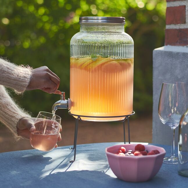 Вместе с банкой с краном из той же серии эта подставка позволяет легко наполнить стакан.