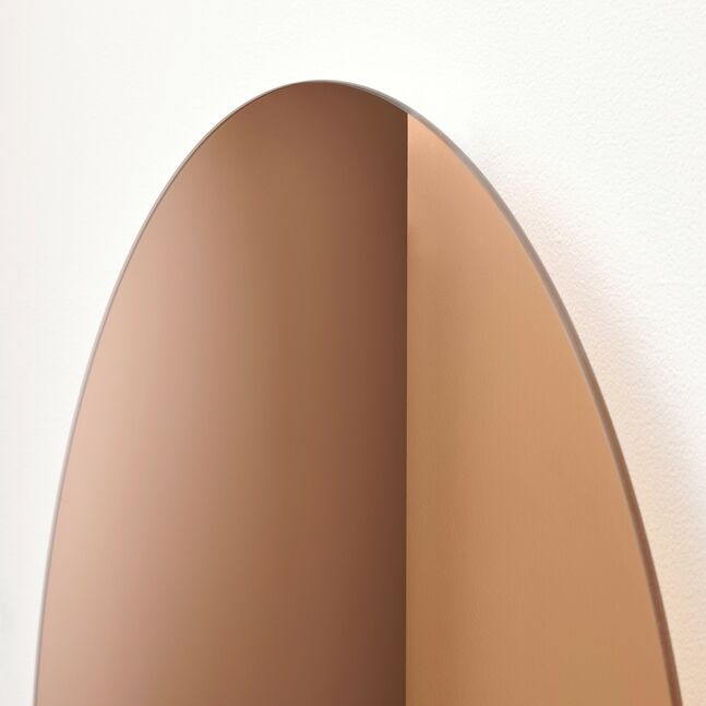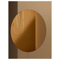 Теплый свет распространяется через стекло бронзового цвета лампы, а тонированное зеркало улавливает естественный свет, заставляя его отражаться в комнате. Это взаимодействие превращается в картину с меняющимися мотивами.