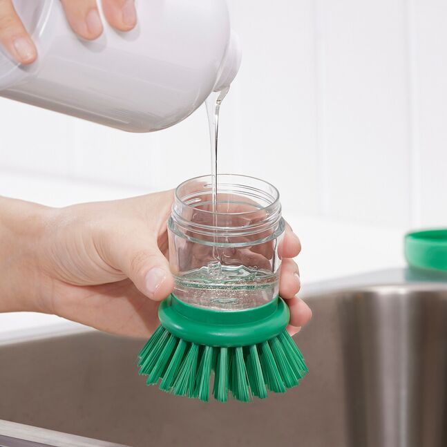 Легкое нажатие на верхнюю часть щетки - все, что нужно, чтобы вылить моющее средство прямо на грязную посуду.